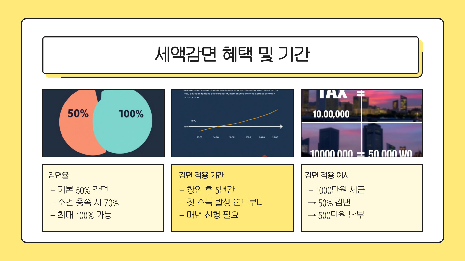 - ✅ 창업 후 5년간 소득세 및 법인세 50% 감면