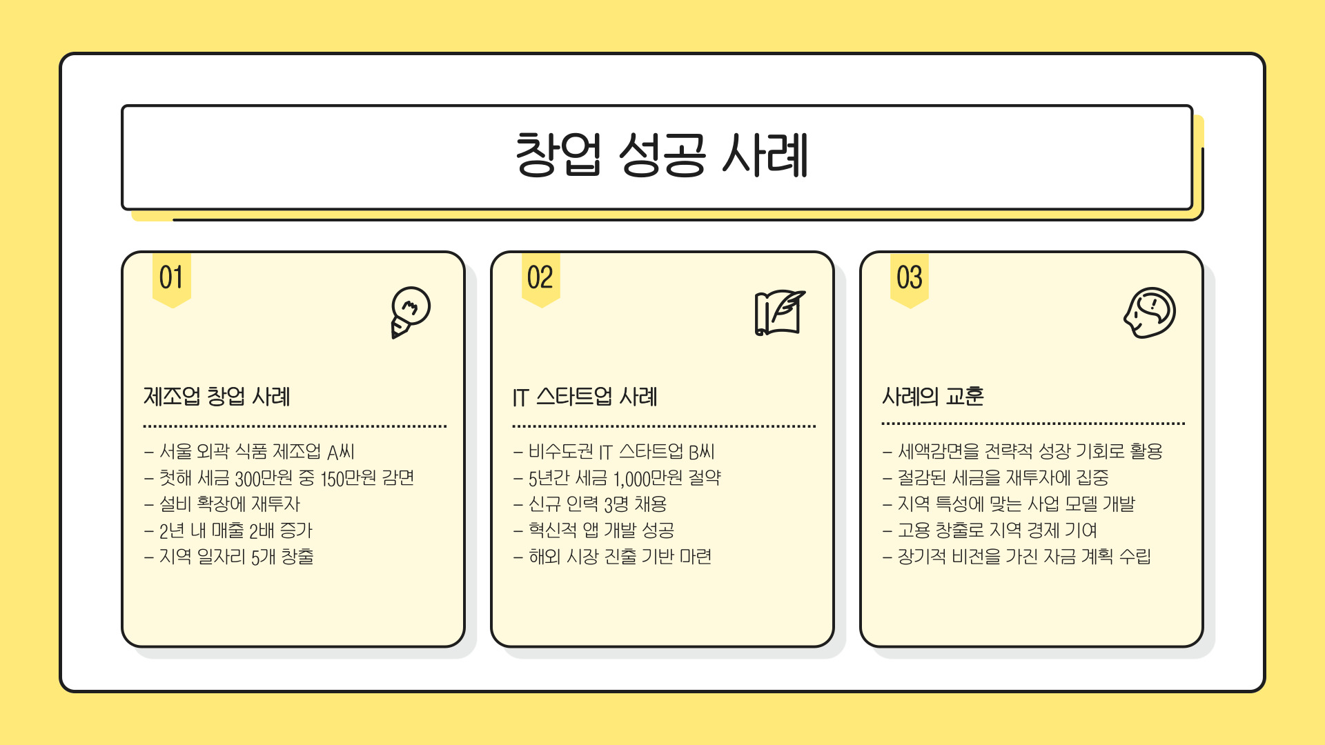 서울 외곽에서 소규모 식품 제조업을 창업한 A씨는 첫해 세금 300만 원 중 150만 원을 감면받아 설비 확장에 재투자하였습니다.
