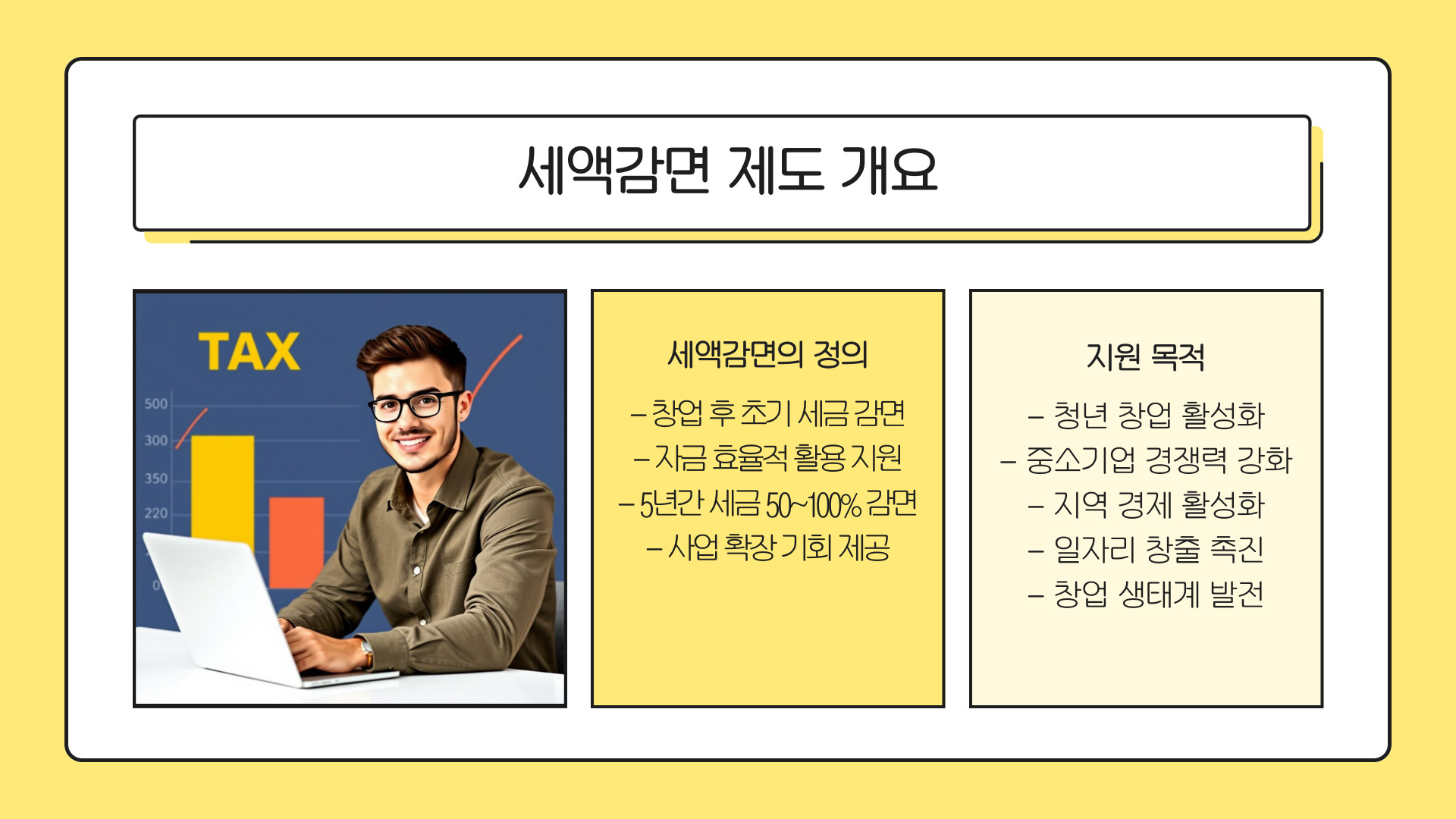 청년 창업자가 창업 후 초기 몇 년 동안 세금을 감면받아 자금을 효율적으로 활용할 수 있도록 돕는 제도입니다. 감면 기간 동안 세금을 줄여 사업 확장을 지원하는 것이 핵심입니다.