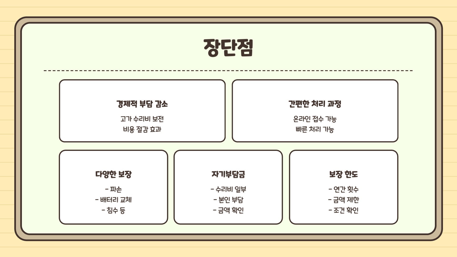 - 수리 가능한 손상의 범위: 고의적인 손상이나 소비자 과실은 보장 제외.