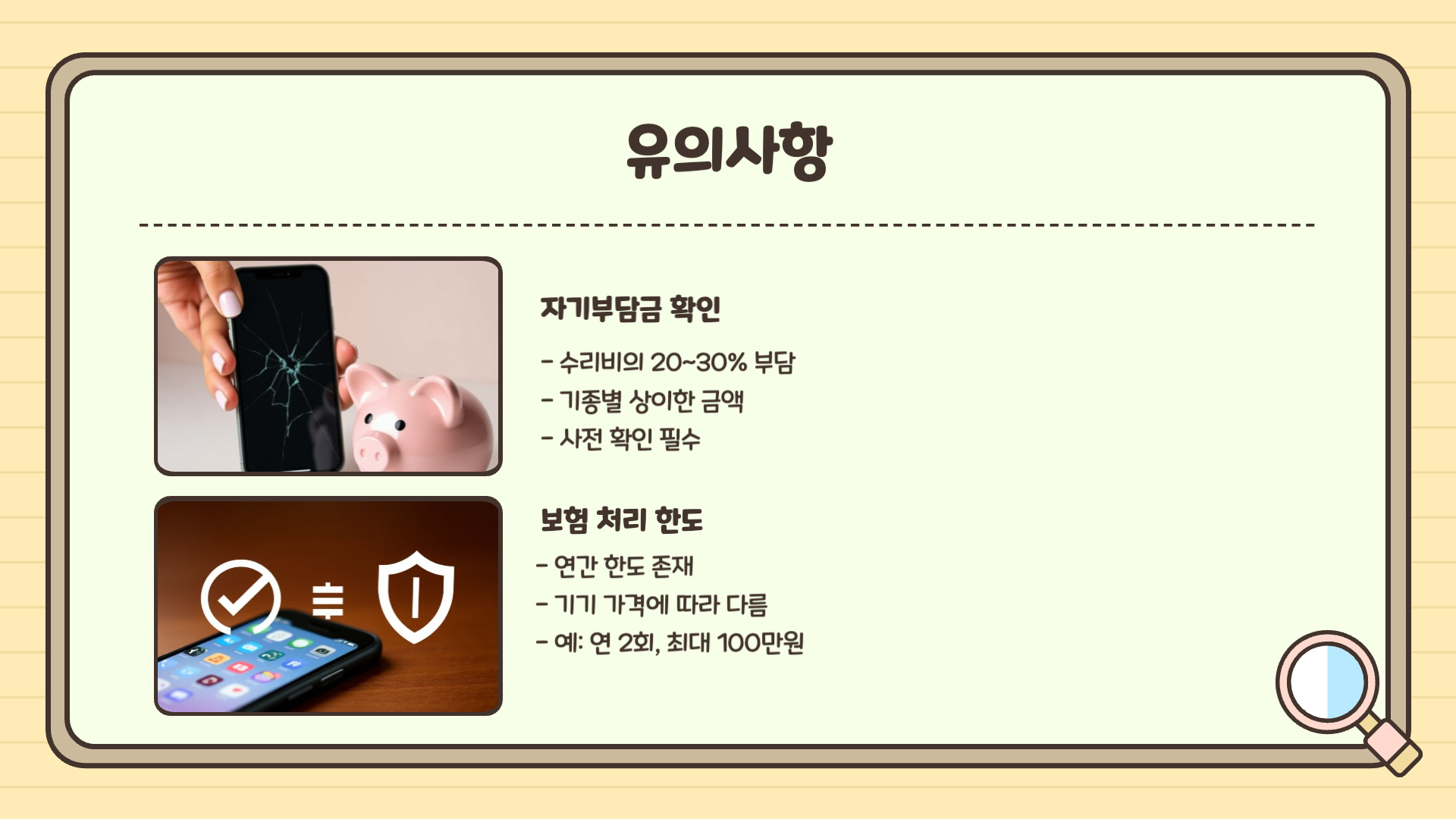 - 보험 처리 한도: 연간 보장 횟수 및 금액 확인 (예: 연 2회, 최대 100만 원).