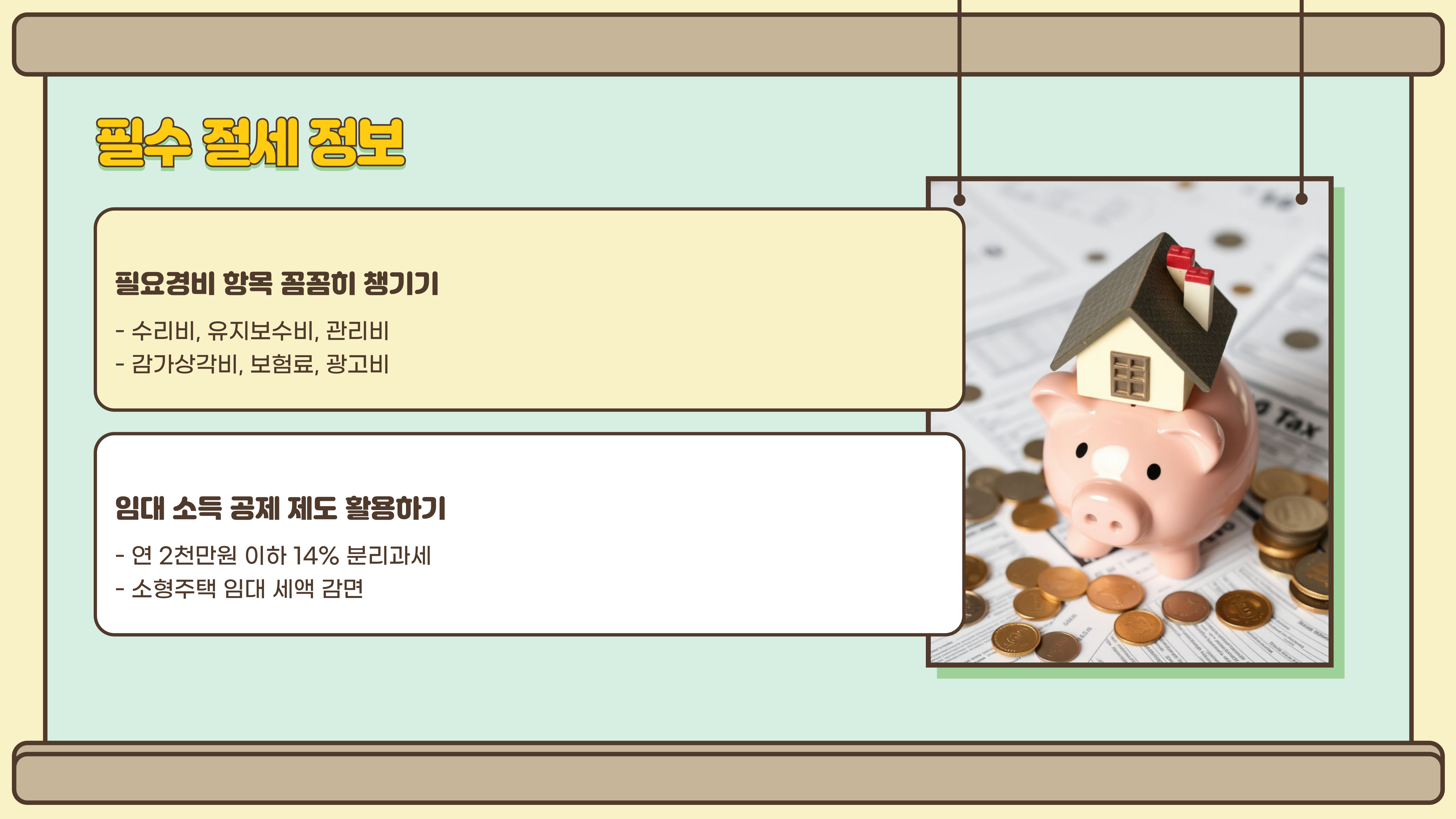 - 금융 비용: 임대 목적 주택 구입 시 발생한 대출 이자