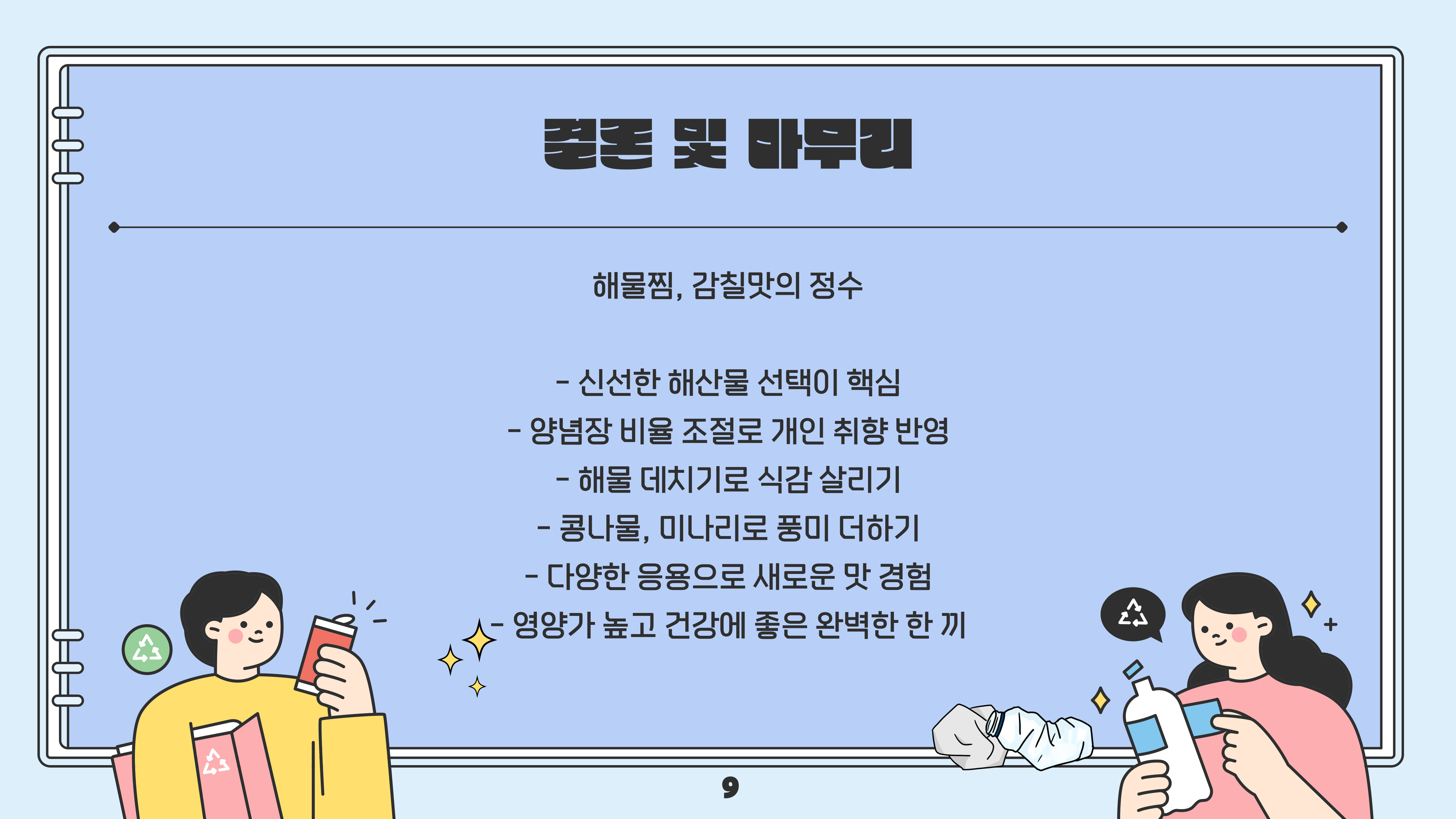 - 곁들일 음식 추천: 해물찜과 함께 시원한 동치미, 백김치, 계란찜을 곁들이면 더욱 맛있게 즐길 수 있습니다.