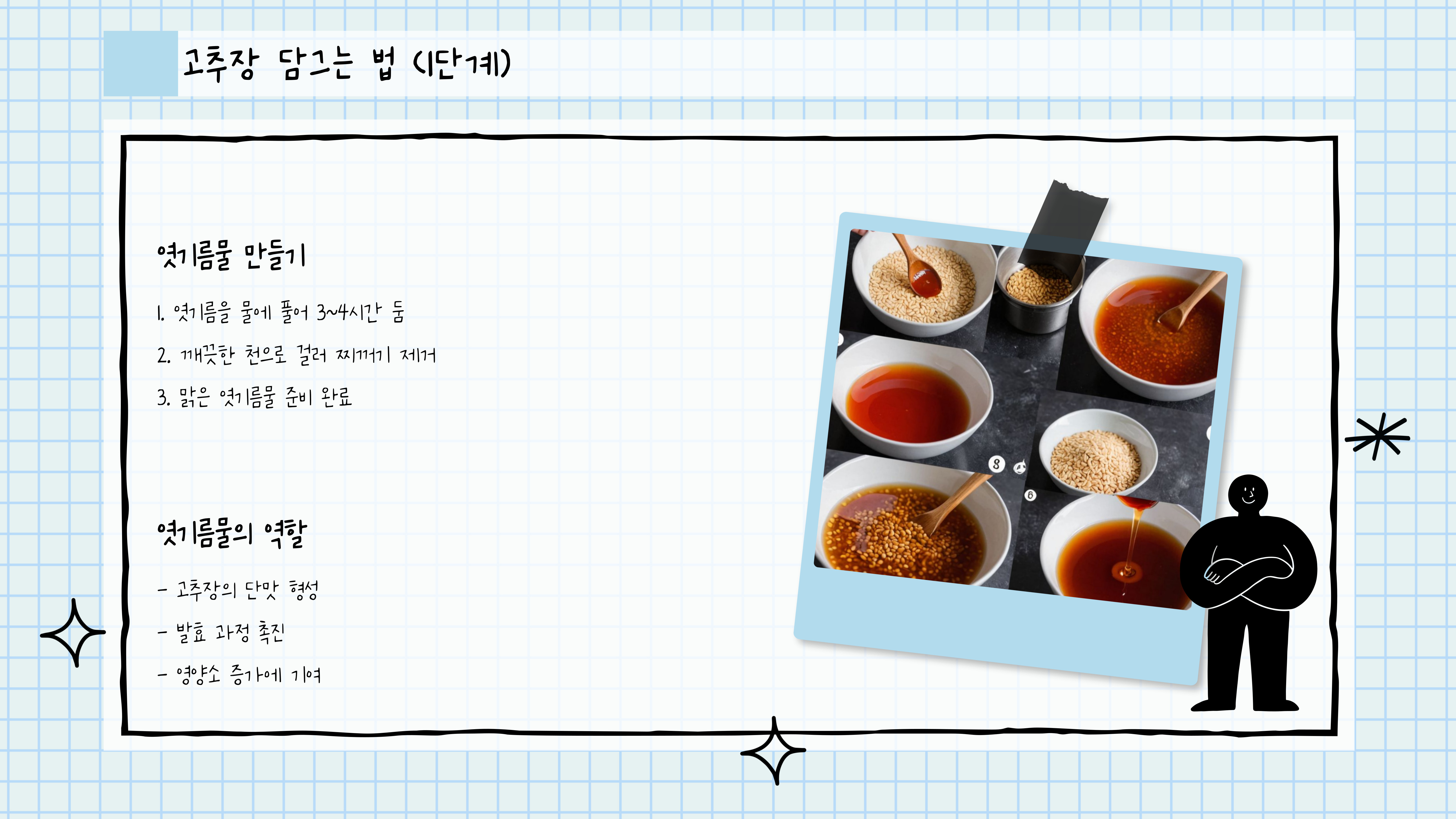 - 엿기름물은 고추장의 단맛과 발효에 중요한 역할을 합니다.